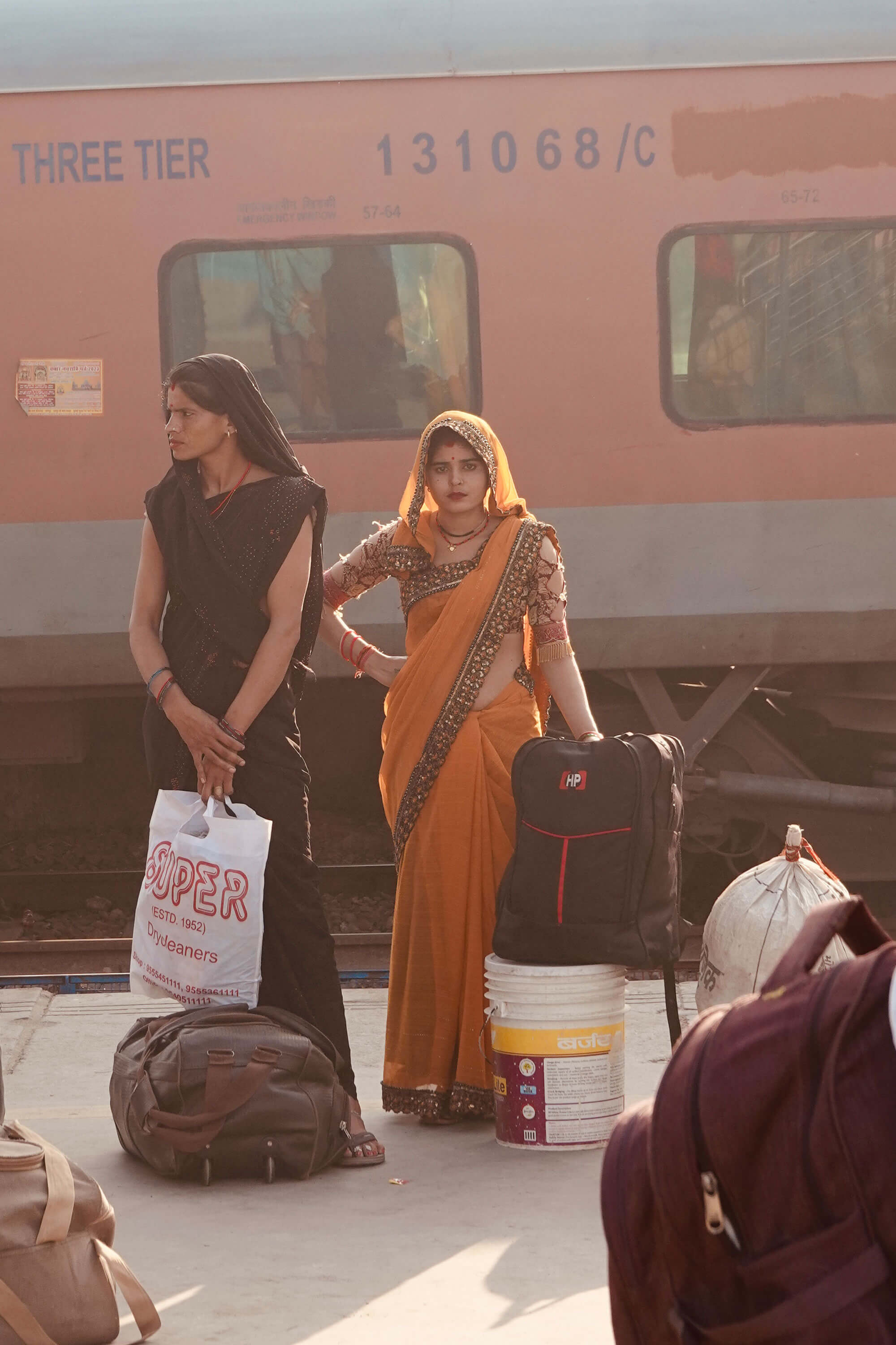 Two women stand patiently on the bustling Delhi platform, bags in hand, waiting for the next chapter of their journey. The sun casts a warm glow on their faces, showing a mix of strength and quiet patience. It's a snapshot of the everyday hustle - a pause in the endless rhythm of the train station where many stories cross paths for just a second.